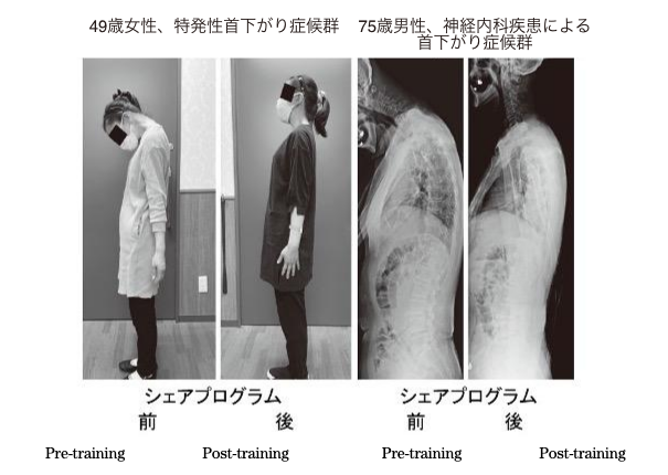 Treatment for dropped head syndrome was considered ineffective through rehabilitation in various domestic and international studies, and surgical treatment has been recommended. For dropped head syndrome, we established a novel rehabilitation program which is called "SHAiR Program" developed based on our experience with over 450 patients. Initially requiring a 2-week hospital stay, this treatment has been introduced as only outpatient service at our clinic, reflecting Director Ishii's desire to "provide patients with the treatment they would want for themselves" and "offer less burdensome treatments." The SHAiR Program includes training to increase neck muscle strength and flexibility and posture exercises aimed at improving overall posture, with one-on-one support from specialized trainers. We typically recommend to keep training for at least 12 times. So far, short-term treatment results have shown an improvement in dropped head symptoms in 92% of all patients (figure).